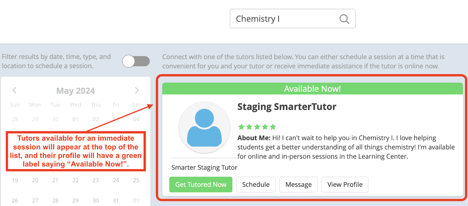 Once you search for your class, youโll be able to see all of the tutors able to help. You can also use the filters on the left side of the screen to refine your results by date, time of day, location, and length of session. Learn more by reading this article: How To Filter For Tutors by Session Date, Time, and Location