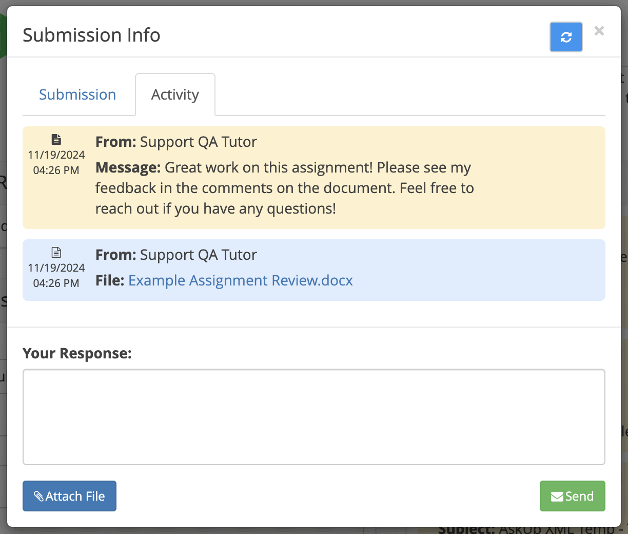 On theย Activityย tab, you communicate with the tutor reviewing your assignment, and download your feedback by clicking on the hyperlinked document!ย