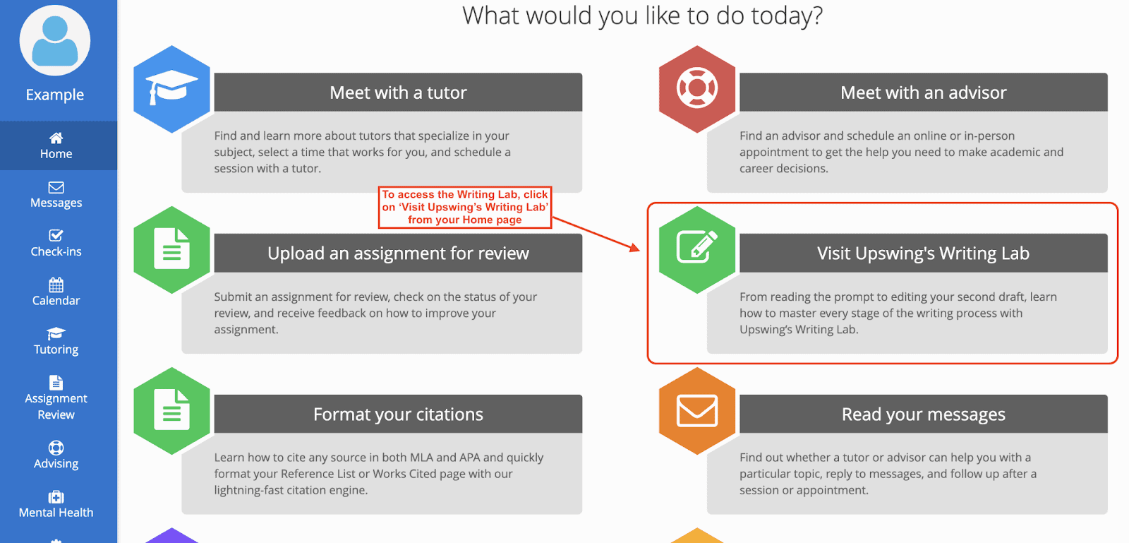 To access the Writing Lab, log into your Upswing account and click on Visit Upswingโs Writing Lab on the home page!